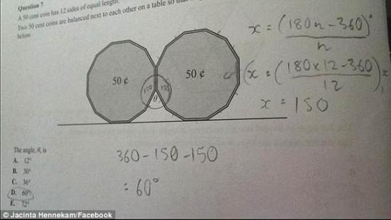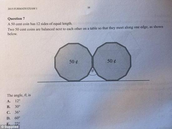 2016年10月30日,澳大利亚维多利亚州举行了一年一度的高考(VCE)。当关键的数学科目考完后,很多考生都去社交媒体上吐槽——其中一道题目实在太难! 题目是这样的:50分的硬币都是正十二边形,把两枚硬币并排放在一起,求夹角。五个选项分别是A. 12° B.30° C.36° D.60° E.72°。 ![]() 难吗?据《每日邮报》报道称,就因为这道题,澳洲12年级的学生(相当于国内高三学生)再也无法直视50分的硬币了! 在接下来的几天里,很多学生都在家里继续苦算答案。而在社交媒体上,它已经成为一个热门话题。连美国著名歌手“50美分”(50 cents)也不幸躺枪。 “去**的50美分!我根本不喜欢你的歌!” “这次考试根本不是为了测试我们,而是在耍我们,这让人怎么准备。”一名学生说。 “对我来说求50分硬币的夹角是不可能的,因为题目没有给出任何其他角度或长度,无法代入公式,所以根本算不出来!”另一名学生总结道。 “这就是个垃圾题目。”还有学生这样告诉《每日邮报》。 “还在算这道题,”一名学生在自己的Facebook上说,并贴了一张两枚硬币放一起的照片,希望实物能给他带来一点灵感。 ![]() 不过在社交媒体上,考生们遭到了网民的嘲笑。他们纷纷表示,对12年级的学生来说,这道题也太简单了吧! 比如,一名父亲就说:“就这还难住了12年级的学生?别逗了!我家5岁的小孩都能算出来!” ![]() 当然也有部分学生答对了。“还好我写对了,不然就太丢人了。 有考生给出了正确的解法。参加高考的学生们你能想到更简单的方法吗? 背景:澳大利亚维多利亚州高考 澳大利亚高考是在每年的10月底,由各州自主命题和组织。维多利亚州高考全称是“维多利亚州证书教育(Victoria Certificate of Education)”,考试合格者可获得高中毕业证书。拥有此证书后,学生可以申请进入大学或职业教育学校。 VCE是享有盛誉的高中文凭,澳大利亚其他州和海外的学校都认可。因为这个原因,近年来VCE在中国也非常热门。中国有多所外国语高中均开办了VCE课程班,如上海外国语大学附属浦东外国语学校,南京外国语学校仙林分校,北京中关村外国语学校等。有些学生会选择放弃国内高考,参加VCE考试。 1、专业的AEAS培训教学团队与VIP服务团队; 2、国内开设最早的AEAS培训学校; 3、AEAS培训学员95%培训后英语成绩能达到70分以上(原始分100分计算); 4、学员调查满意度98%以上。95%学员培训后提升幅度30分以上(英语成绩); |