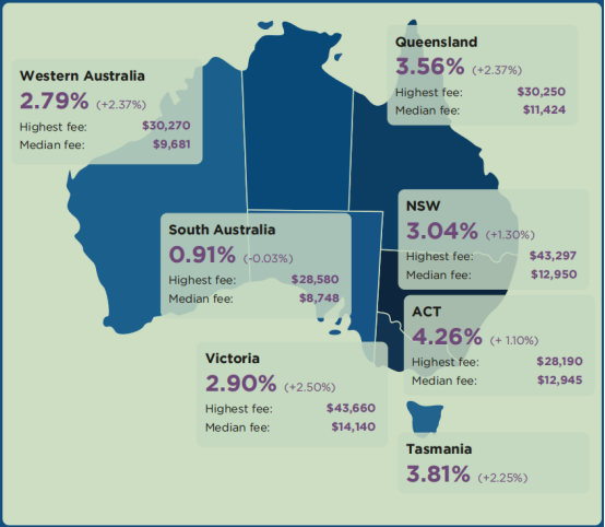 过去10年来,悉尼私立学校的学费平均上涨了50% 以上,有些私校的学费甚至上涨了80%以上,这远远超过了22%的通货膨胀和29%的工资增长速度。 此前,大多数学校的学费在2021年期间实行较小的增幅,要么学费不变,以便在新冠期间为家庭提供救济并保留入学人数。 但是,到了2022年,悉尼私立学校的家长,将平均多支付3.04%的学费。 在这种增幅情况下,早期迹象表明,私立学校将在 2023 年大幅提高学费,预计涨幅在 4% 至 10%。 其实,不只是悉尼,整个澳洲的私校在2022年都有不同程度的上涨,具体看下图:
