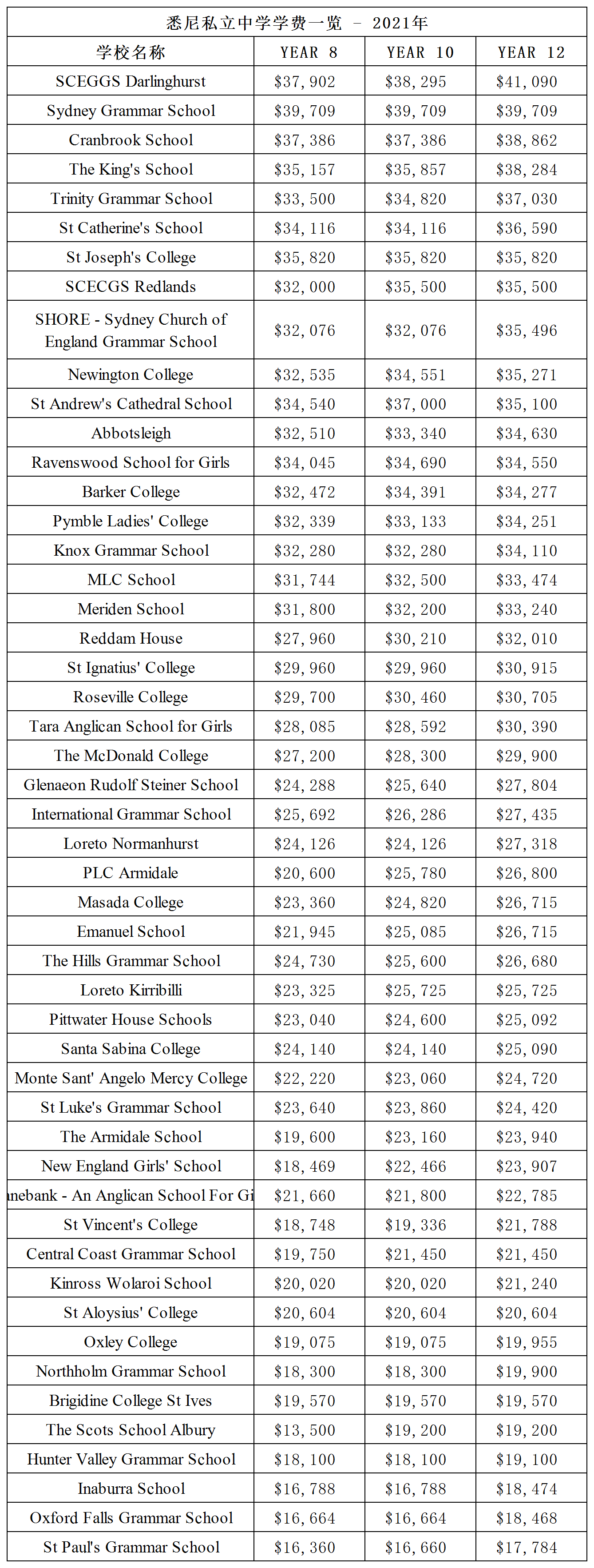 据报道,学费上涨最厉害的是悉尼北区的私校,学费平均增长了3.78%,而该地区的学费中位数为$30,003。 像Knox Grammar和Ravenswood这些收费高的中学,学费已经超过了3.5万澳币。 另外,在悉尼中西区,私立学费的学费平均上涨了3.69%,比如Newington College, MLC、PLC,这几所遐迩闻名的私校,学费均在3.4万澳币以上。 学费涨幅比较小的是悉尼东区的私校,平均上涨了2.54%,但它们依然整个悉尼学费最贵的学校,仅12年级的学费中位数就高达34,183澳元。 该地区比较顶尖的三所学校——The King’s School, The Scots College和SCEGGS Darlinghurst——今年12年级的学费已经超过了 40,000 澳币,折合人民币将近19万。 那么,悉尼有没有学费比较便宜的私校呢? 有,那就是位于悉尼西区和西南区的私校,虽然学费上涨了3.39%,但学费中位数仅为6856澳币,不过这些私校在国际生申请队伍中,知名度并不是很高,相对于其它几个区的私校,教学质量也没有那么好。 不过,话说回来,虽然澳洲私校学费贵,涨幅大,但还是有很多家庭愿意花重金把孩子送到私校读书,因为教育设施好,教育水平高,升学率也高。 在澳洲比较好的私校里,一个 10 泳道的室内游泳池、舞蹈练习室、瑜伽工作室、大型音乐演播厅、演讲室、计算机中心,甚至是世界级的马术练习中心、航空俱乐部等,都是学校标配。 因此,即便是学费如此之贵,在过去20年,私立学校入学人数反而增长了20%,是所有学校类型中人数增长最快的。 我们汇总了悉尼规模最大的50所私立中学的学费,供各位家长参考,具体详情可联系私校官方进行确认。 (悉尼私校学费参考) 学费只是最基本的收费,在私校读书,还有一系列额外费用需要家长们支付。比如: l 申请费——大约 100 到 500澳币。 l 报到注册费——大约 500 到 2,500 澳币,有私校可能会更高,达到8100澳币。 l 寄宿费 l 强制购买IT设备 - 笔记本电脑和平板电脑 l 国际文凭税——通常每年2000澳币以上 l 额外的科目费用——例如音乐、语言、体育课 l 特别课程计划费用 l 学校露营和旅行 l 制服费 l 音乐器材租用 l 校车服务 l 书本费 l 学前和课后托管费用 l 筹款支持(自愿) 因此,家长们在为孩子择校时,一定要提前做好预算。 更多AEAS及澳洲留学咨询,请添加课程顾问微信