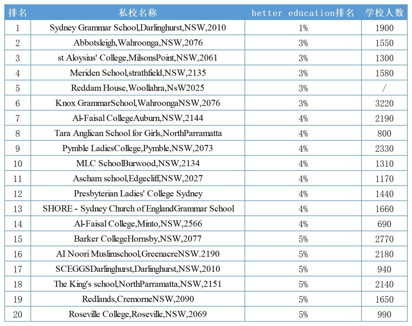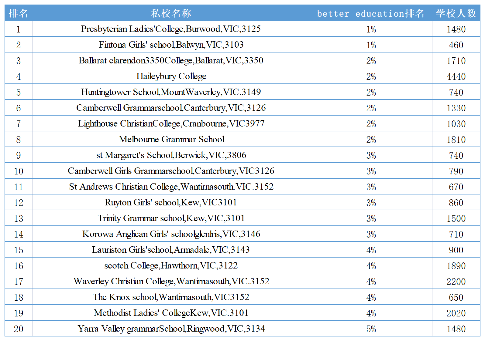 其实,全世界的教育都有一个共性:要考生一所好大学,中学阶段的学习尤为重要,因此,很多家长不惜花重金为孩子选一所高质量的中学。 目前国内有不少家长把孩子送到澳洲读私立中学,看重的不但是学科课程的质量,更加看重的还有对孩子综合素质的培养,这一点,澳洲私立中学确实比国内同阶段偏应试教育的中学,确实有优势。 那么,2022年,澳洲最好的私立中学有哪些? 我们根据权威排名网站better education给出的最新数据进行整理,挑选出了教育最优质也是最受国际生欢迎的私校。 澳洲私校由教会、企业、私人建立,有教会学校、独立中学、大学附属中学,招生由每所学校单独管理,单独划定国际生招生名额。 教会学校秉承了英国传统教会学校的教学方式,除了教授学业,还会要求学生的言行举止。 独立中学,通常历史悠久,多以创始人名字来命名,有自身独特的教学方式,凭借积累的教学声誉来吸引生源。 大学附属中学由澳洲大学开设,一般与大学校园相距不远,以大学的教学设施和师资帮助学生提前感受到大学的学习氛围,有利于将来进入大学深造。 因为澳洲私校在校舍、教学设施、学校管理、师资力量、场地等方面投入较大,因此,学费要比公立中学贵很多,近几年澳洲私校还有上涨趋势,通常是每年20000-40000澳元不等。 提醒一点:申请私立中学,除了成绩单外,要求额外提供AEAS考试或雅思成绩,并且通过入学面试考察学生的综合素质—性格品行、语言表达、思维心理等,以保证学校的教学成果最优化。