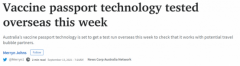 澳洲贸易部长 Dan Tehan于近日表示,关于澳洲疫苗护照的二维码系统将于本周在美国、英国、日本和新加坡试行。 预计澳洲 解封计划11月底将实现,疫苗接种率达到80%后,国际边境开放,已接种疫苗的民众可以出国旅行,