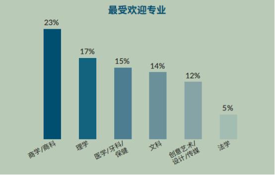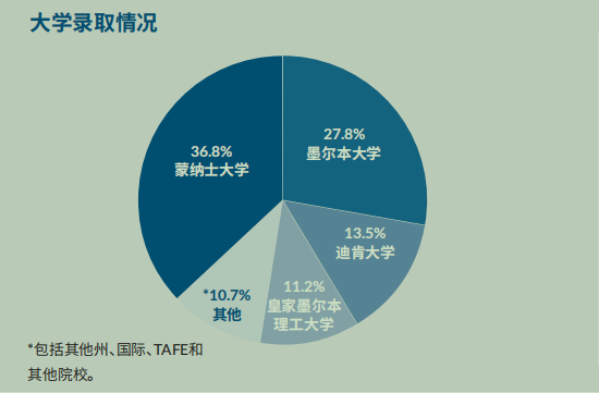 在其他州,该校毕业生获得了来自新南威尔士大学、阿德莱德大学、昆士兰大学、澳大利亚国立大学和邦德大学等高等学府的录取通知。在国际方面,收到了来自英美高校的录取通知。 最受毕业生偏爱的专业领域为:商科(23%),理科(17%),生物医药/保健、牙科和医学(15%),文科(14%),创意艺术、设计和传媒(12%),以及法学(5%)。